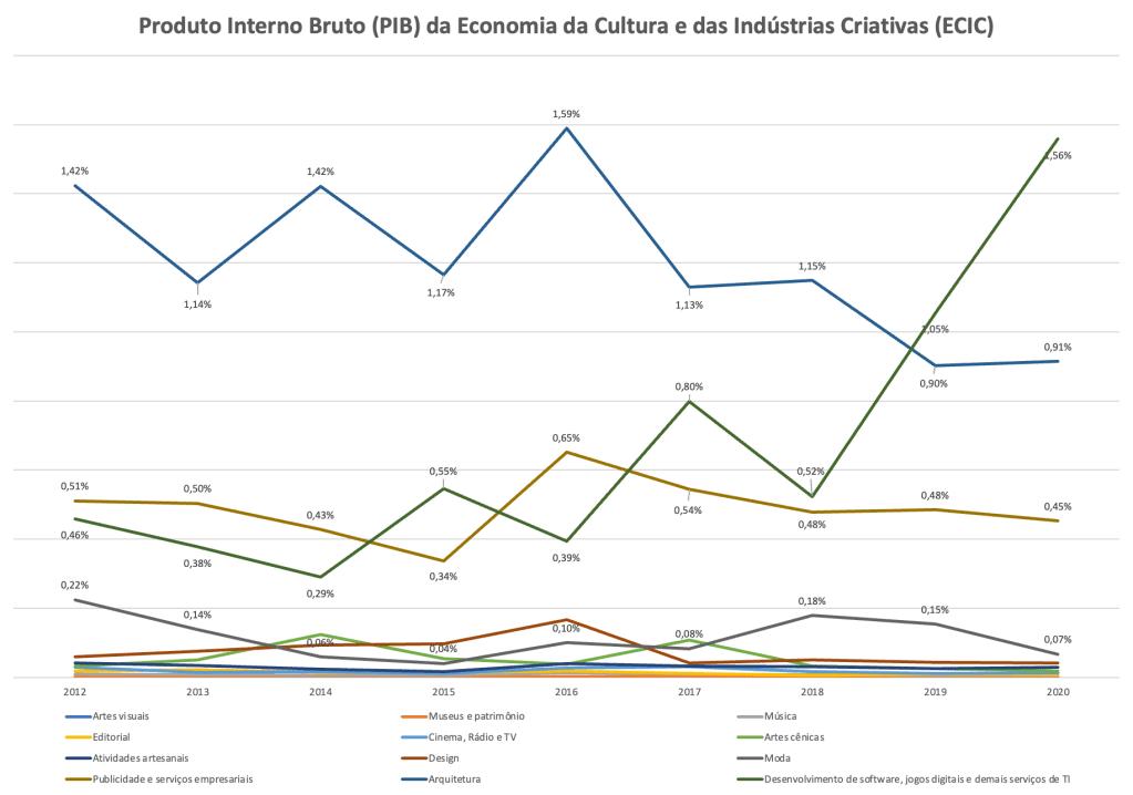 Ao analisar o crescimento do PIB da da Economia da Cultura e Indústrias Criativas (ECIC) entre 2012 e 2020, observa-se um aumento de 78%, enquanto a economia total do país cresceu 55% no mesmo período, segundo Painel de Dados do Observatório do Itaú Cultural. Isso indica que a ECIC tem demonstrado resiliência e potencial para contribuir ainda mais para o desenvolvimento econômico do Brasil.