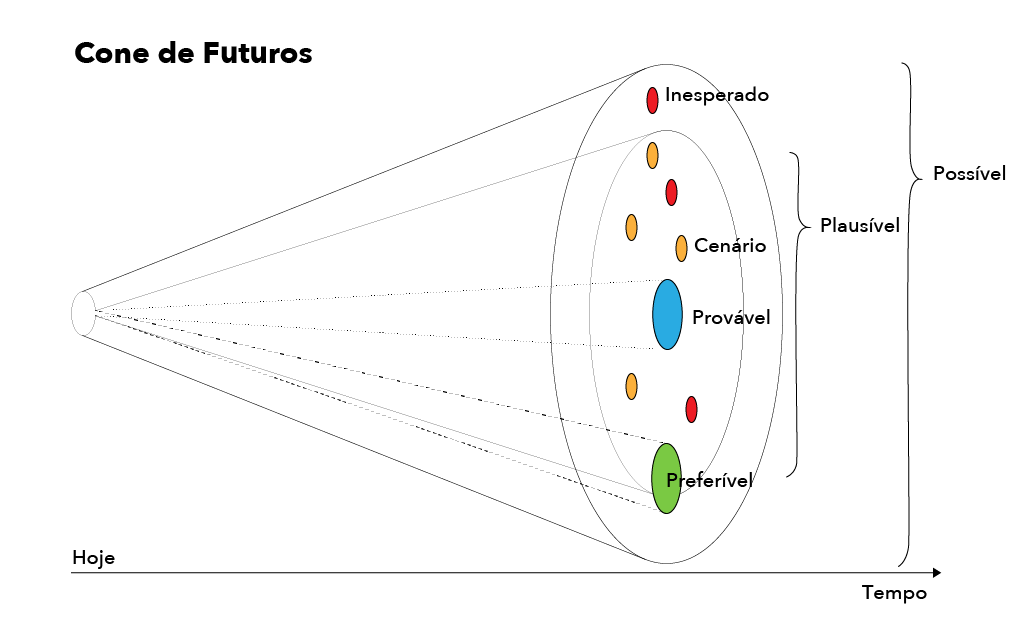 Frequentemente você verá o termo Futuros, no plural. E há uma razão para isso. O futuro, no singular, não existe, o que existe é o presente. As práticas ligadas aos estudos de futuros, foresight, futuros especulativos, prospecção de cenários, dentre outras abordagens, referem-se a exercícios de antecipação e envolvem especulações, análise de possibilidades, perspectivas, desenho de cenários, que por meio conceitos, métodos, técnicas e ferramentas, realizam observações sobre o passado e o presente, analisam sinais e tendências e com isso nos permitem projetar, imaginar futuros possíveis e seus desdobramentos.
